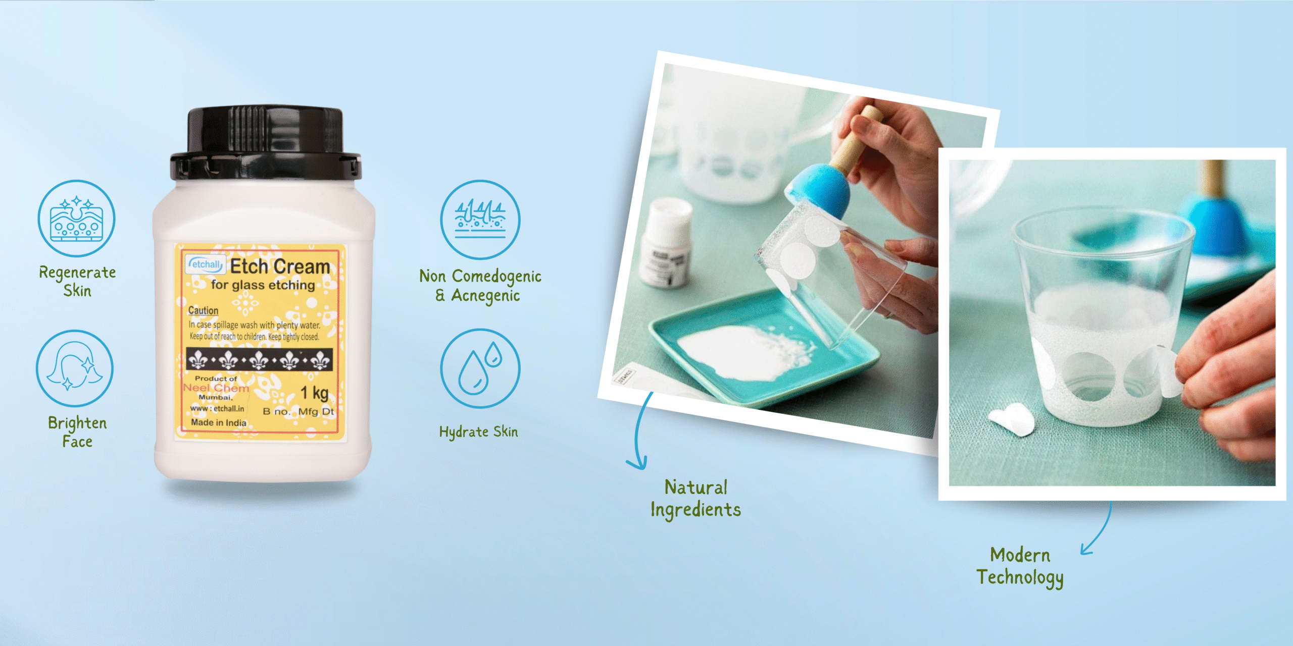 We manufacture Etch-Cream, Etch-Stencil, and Etch-Lotion—each designed to make glass etching safe, fast, and simple.
