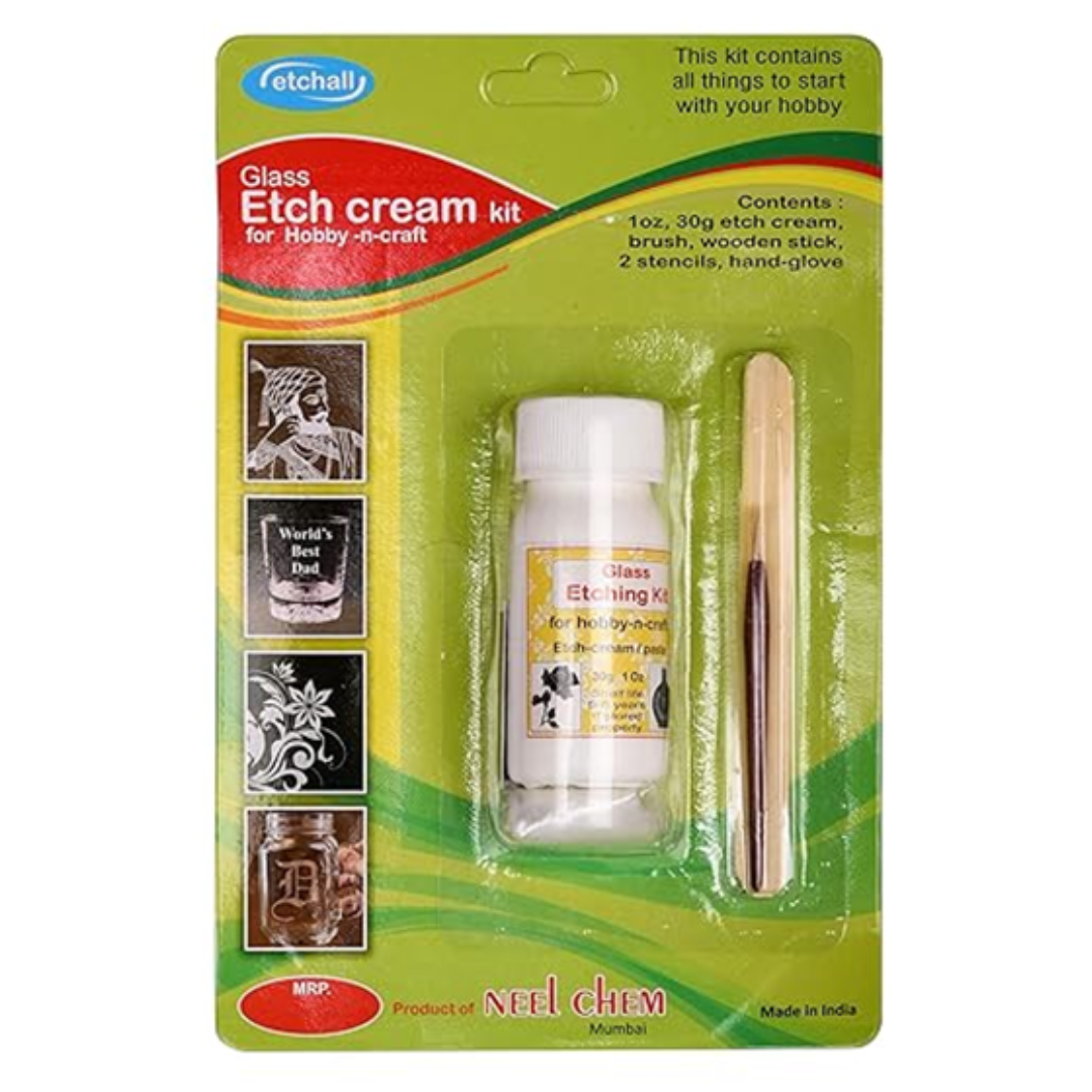 Hobby Kit It contains etch cream 50 g, 1, 6-8 per cut vinyl stencils, Brush/bud, plastic bowl, Scrapers, tissue paper, box to keep arranged and manual.